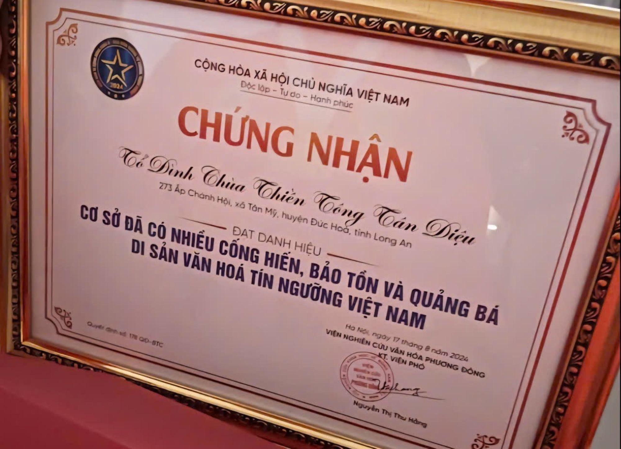 Theo thông tin được biết, ngày 17/8/2024, bà Nguyễn Thị Thu Hằng, Phó Chủ tịch viện Nghiên cứu Văn hóa phương Đông ký giấy chứng nhận “Tổ đình chùa “Thiền Tông Tân Diệu”, một cơ sở tôn giáo trái phép tại huyện Đức Hòa tỉnh Long An (nay là tỉnh Tây Ninh) đạt danh hiệu “Cơ sở đã có nhiều cống hiến, bảo tồn và quảng bá di sản văn hóa tín ngưỡng Việt Nam” và cá nhân ông Nguyễn Công Nhân,. Từ Giấy chứng nhận này và các giấy chứng nhận của Liên hiệp các Hội UNESCO Việt Nam, Nguyễn Công Nhân và đồng bọn tổ chức truyền thông, quảnh bá trái phép tôn giáo vi phạm pháp luật. Hiện nay Bộ Công An đang điều tra, xác minh làm rõ các đối tương cá nhân và các tổ chức liên quan để xử lý.