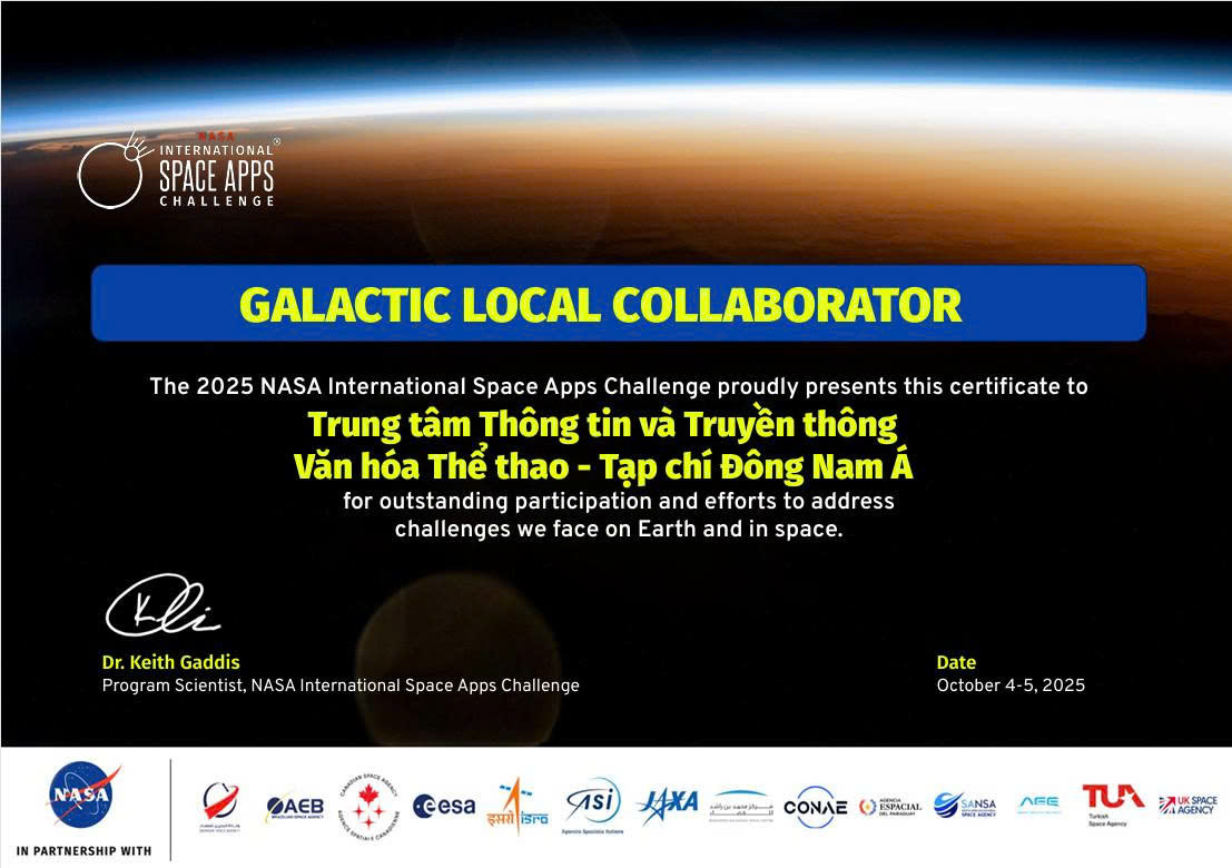Seatimes – (ĐNA). Từ niềm đam mê khoa học không gian và khát vọng vươn tầm thế giới, Trung tâm Thông tin và Truyền thông Văn hóa Thể thao – Tạp chí Đông Nam Á là đơn vị truyền thông đầu tiên của Việt Nam ghi dấu mốc lịch sử khi được Chương trình Thử thách Ứng dụng Không gian Quốc tế (NASA Space Apps Challenge) năm 2025 trân trọng trao chứng nhận vì những nỗ lực xuất sắc trong việc giải quyết các thách thức của Trái Đất và không gian.